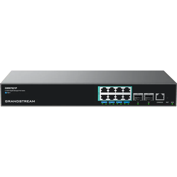 The Grandstream GWN7821P is a Layer 3 managed network switch built for small to medium-sized enterprises that require high-performance networking and advanced management. It offers eight 2.5GbE RJ45 ports, all supporting PoE++ (IEEE 802.3bt) with a total power budget of 240W, making it ideal for powering devices such as Wi-Fi 6 access points, PTZ cameras, and high-end VoIP phones.