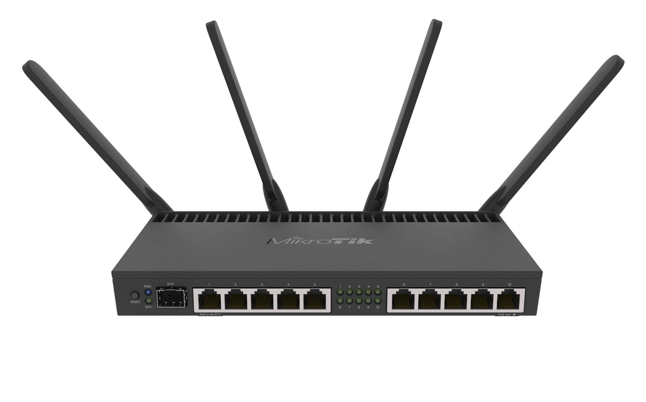 The MikroTik RB4011iGS+5HacQ2H is a desktop router designed for small offices, data centres, and power users. It features a quad-core AL21400 Cortex-A15 CPU operating at 1.4 GHz, 1 GB of RAM, and 512 MB of NAND flash, running RouterOS v7 with License 5. This device provides AC2000-class Wi-Fi with dual-band capabilities: dual-chain 2.4 GHz supporting speeds of 300 Mbps and quad-chain 5 GHz reaching up to 1733 Mbps through integrated antennas. Connectivity includes ten Gigabit Ethernet ports, a 10 Gbps SFP+ cage, passive PoE-IN (18–57 V), and PoE-out on port 10. The unit is housed in a compact metal case measuring 228 × 120 × 30 mm, featuring passive cooling and an IP20 rating for indoor use, with an operational temperature range of -40°C to +45°C. It also includes IPsec hardware acceleration and temperature/voltage monitoring. The package comes with a 24 V/2.5 A power adapter, and power consumption is up to 23 W (without PoE-out) or a maximum of 44 W. The RB4011 is suitable for users requiring advanced wired and wireless networking capabilities in a compact form factor.