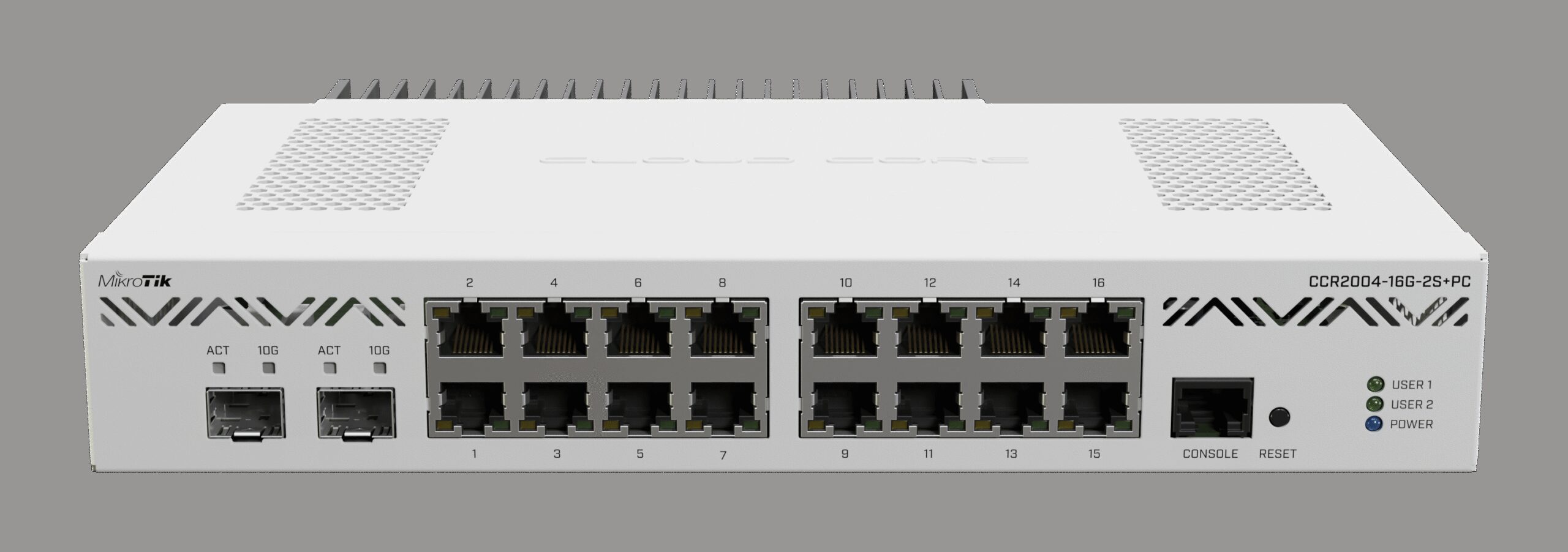 The MikroTik CCR2004-16G-2S+PC is a passively cooled Cloud Core Router designed for quiet operation in demanding environments. Powered by a 4-core Altra AL32400 ARM 64-bit CPU at 1.7 GHz, it delivers high processing power for routing, firewalling, VPNs, and BGP applications. Sixteen Gigabit Ethernet ports connect directly to the CPU for high-speed throughput, complemented by two 10G SFP+ ports for fibre uplinks, supporting hybrid copper and fibre networks.