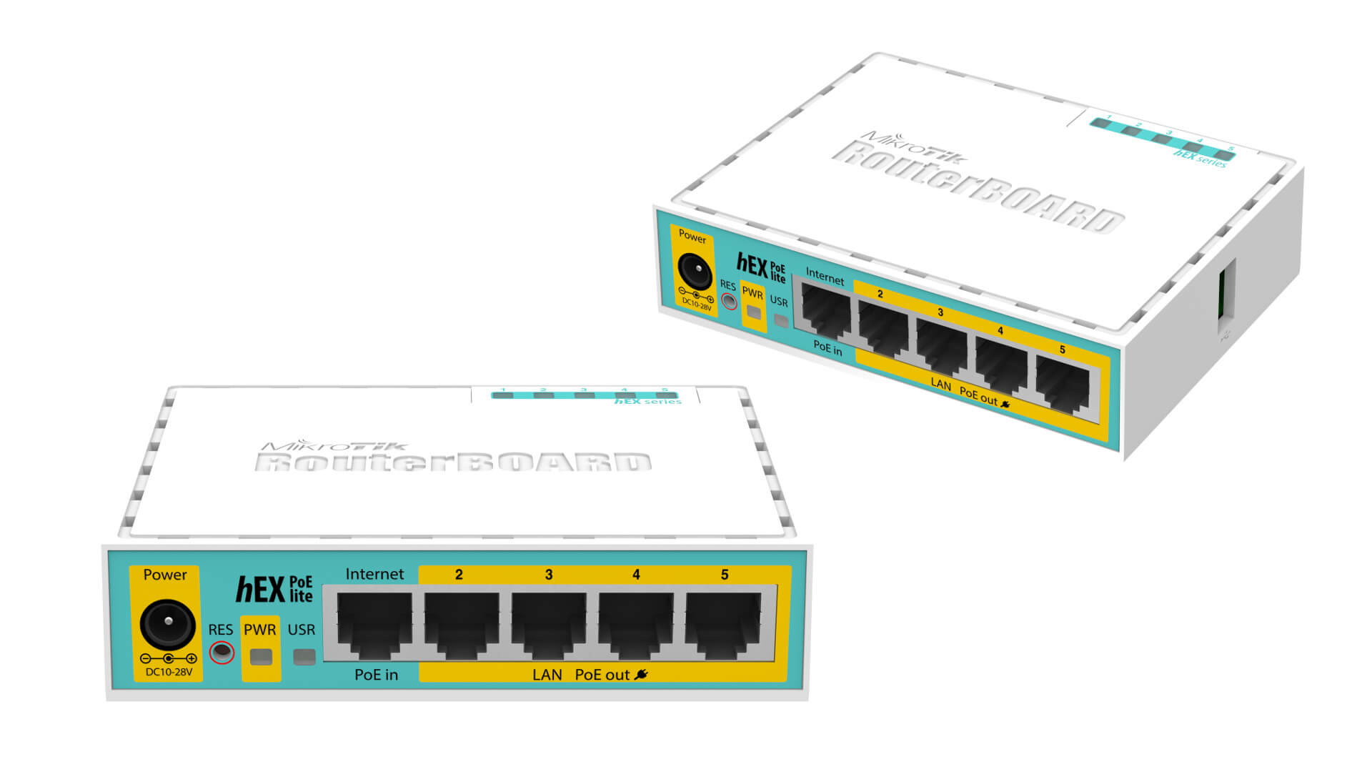 The hEX PoE lite is a small 5 port Ethernet router in a plastic case. It has an USB 2.0 port and PoE output and ports 2-5 can power other PoE capable devices with the same voltage as applied to the unit. The max current is 1A per port, and the Ethernet ports are shielded. It fits perfectly into any SOHO environment.