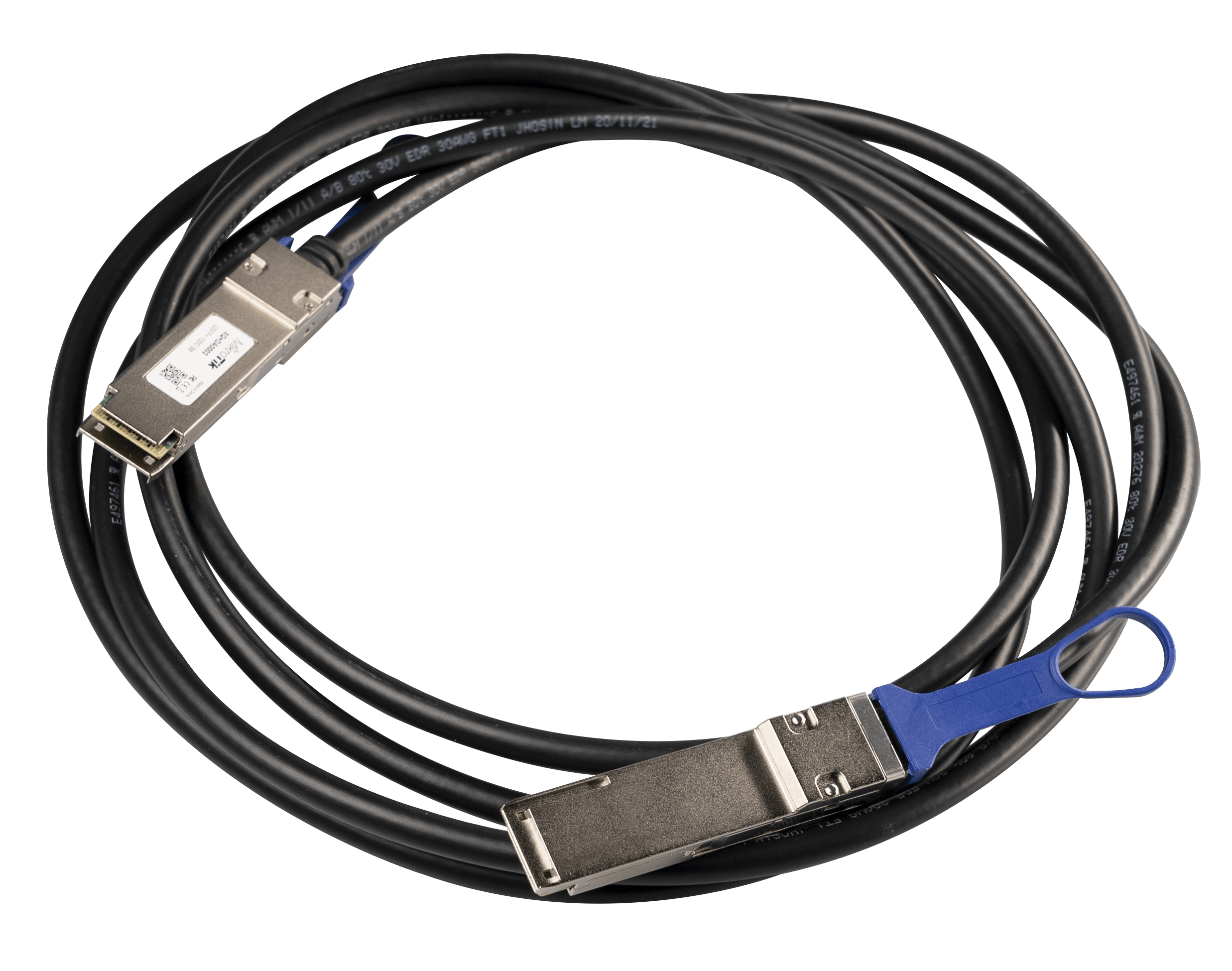 The MikroTik 100 Gigabit product line is here. This cable has integrated QSFP28 modules. Just plug it in and enjoy the speed! The cable is three meters long, the perfect length to reach all the necessary spots while keeping your server room neat and tidy. It is fairly flexible – you can keep your devices apart or on top of each other.